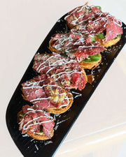 Toasted crostini topped with beef, truffle aioli and parmesan shavings.